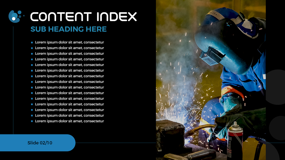 - An index page sets expectations and helps the audience navigate the presentation with ease.
